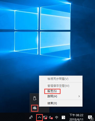 於工作列︿圖示按一下,在 OneDrive 圖示按滑鼠右鍵,選「設定」。